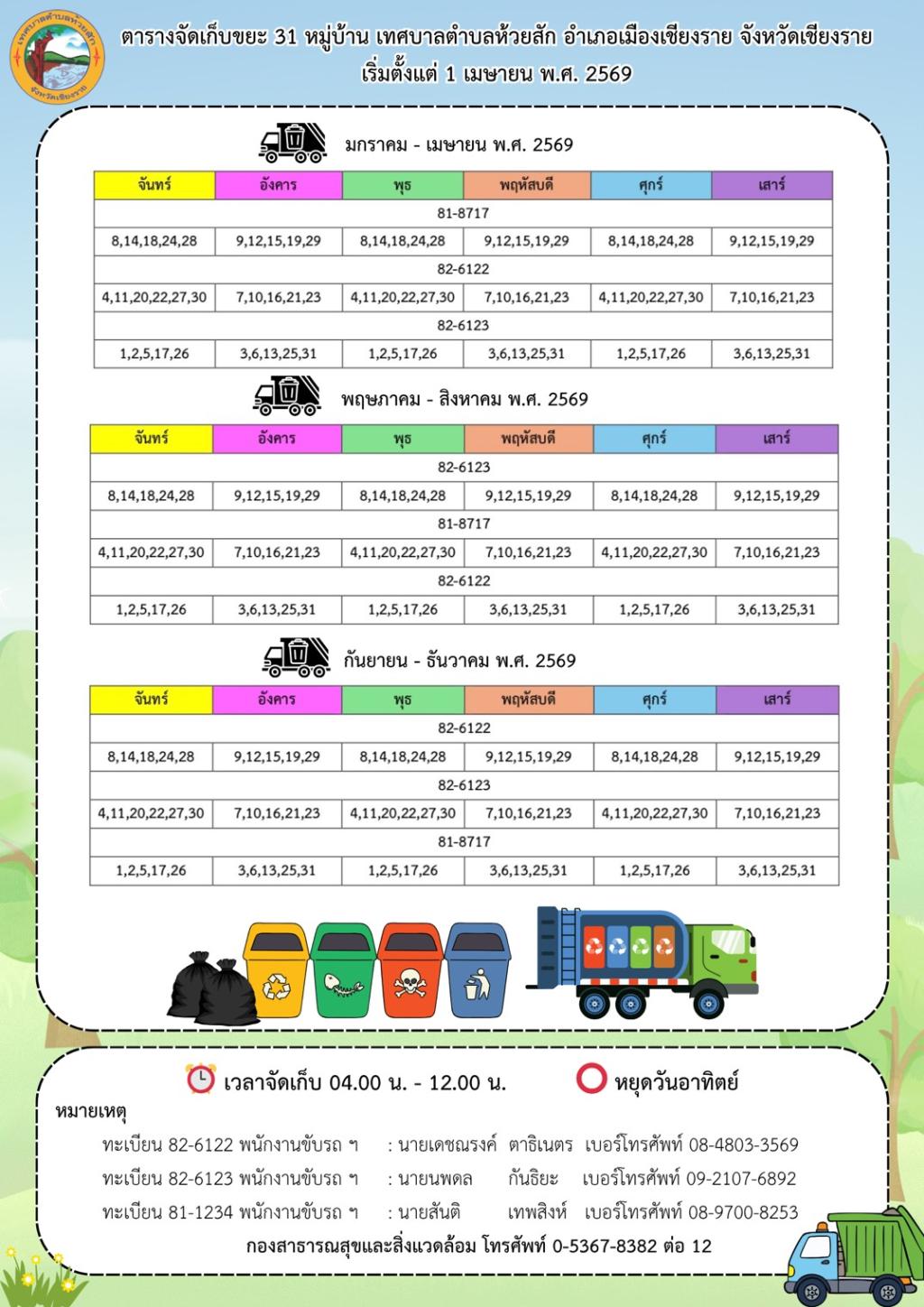 กองสาธารณสุขและสิ่งแวดล้อม เทศบาลตำบลห้วยสัก แจ้งประชาสัมพันธ์ตารางจัดเก็บขยะ 31 หมู่บ้าน โดยเริ่มจัดเก็บวันที่ 1 เมษายน 2569...
