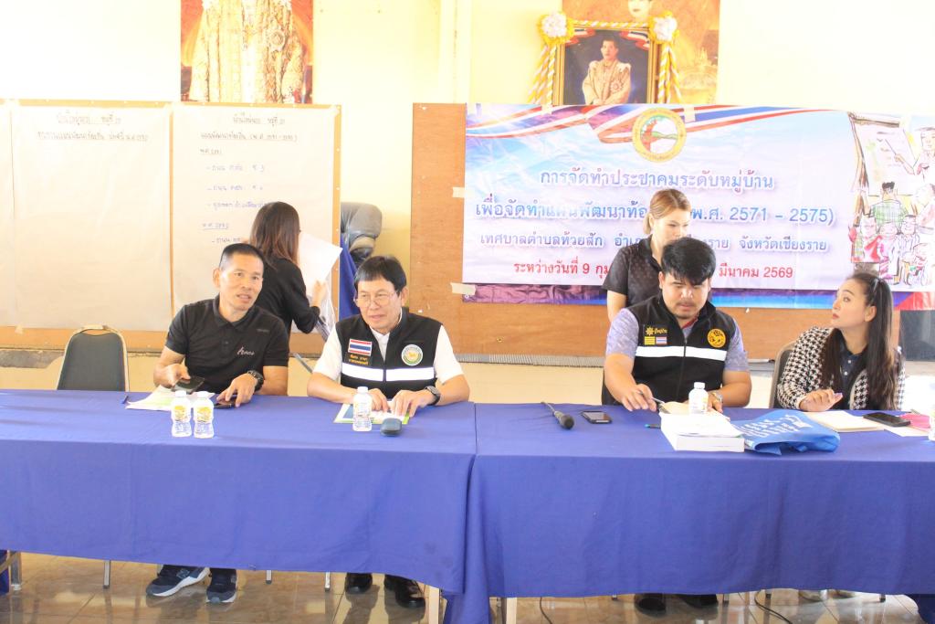 วันพฤหัสบดีที่ 12 กุมภาพันธ์ 2569 เวลา 09.00 น. นายพิเศษ อาษา นายกเทศมนตรีตำบลห้วยสัก นายยอด อินเรียน รองนายกเทศมนตรีตำบลห้วยสัก สมาชิกสภาเทศบาล สิบตำรวจตรีถนอม วุฒิ ปลัดเทศบาลตำบลห้วยสัก นายอาทิตย์ เป็กธนู หัวหน้าสำนักปลัดเทศบาล นางสาวทิพวัลย์ ดิษละ หัวหน้าฝ่ายบริหารงานทั่วไป นางสาวนุชนาถ วัชรจิตกุล นักวิเคราะห์นโยบายและแผน พร้อมผู้ช่วยนักวิเคราะห์นโยบายและแผน ลงพื้นที่บ้านใหม่นาวา หมู่ที่ 20 ในการจัดทำประชาคมระดับหมู่บ้าน เพื่อจัดทำแผนพัฒนาท้องถิ่น (พ.ศ.2571 - พ.ศ.2575) โดยมีนายเทพรักษ์ จันต๊ะนาเขต ผู้ใหญ่บ้าน หมู่ที่ 20 บ้านใหม่นาวา ร่วมจัดทำแผนและอำนวยความสะดวกให้กับเจ้าหน้าที่เทศบาลตำบลห้วยสัก ณ อาคารอเนกประสงค์บ้านใหม่นาวา หมู่ที่ 20 อำเภอเมืองเชียงราย จังหวัดเชียงราย