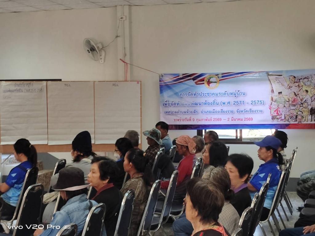 วันศุกร์ที่ 13 กุมภาพันธ์ 2569 เวลา 09.00 น. นายพิเศษ อาษา นายกเทศมนตรีตำบลห้วยสัก นายยอด อินเรียน รองนายกเทศมนตรีตำบลห้วยสัก สมาชิกสภาเทศบาล สิบตำรวจตรีถนอม วุฒิ ปลัดเทศบาลตำบลห้วยสัก นางสาวทิพวัลย์ ดิษละ หัวหน้าฝ่ายบริหารงานทั่วไป นางสาวนุชนาถ วัชรจิตกุล นักวิเคราะห์นโยบายและแผน พร้อมผู้ช่วยนักวิเคราะห์นโยบายและแผน ลงพื้นที่บ้านป่าก๊อ หมู่ที่ 4 ในการจัดทำประชาคมระดับหมู่บ้าน เพื่อจัดทำแผนพัฒนาท้องถิ่น (พ.ศ.2571 - พ.ศ.2575) โดยมีนายพลวรรธน์ วิบูลย์มา ผู้ใหญ่บ้าน หมู่ที่ 4 บ้านป่าก๊อ ร่วมจัดทำแผนและอำนวยความสะดวกให้กับเจ้าหน้าที่เทศบาลตำบลห้วยสัก ณ อาคารอเนกประสงค์บ้านป่าก๊อ หมู่ที่ 4 อำเภอเมืองเชียงราย จังหวัดเชียงราย
