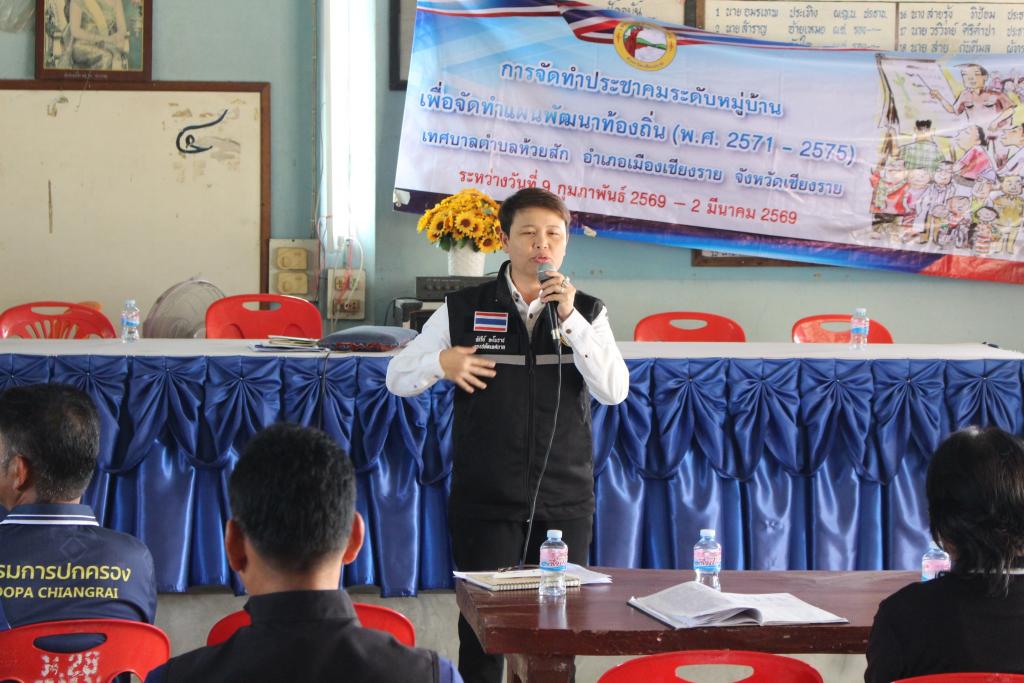 วันพฤหัสบดีที่ 19 กุมภาพันธ์ 2569 เวลา 09.00 น. นายยอด อินเรียน รองนายกเทศมนตรีตำบลห้วยสัก นางนงเยาว์ มหายศ รองนายกเทศมนตรี นายชูชาติ สุขสามปัน ประธานสภาเทศบาล สมาชิกสภาเทศบาล สิบตำรวจตรีถนอม วุฒิ ปลัดเทศบาล นางสาวอัชรีย์ อะโนราช รองปลัดเทศบาล นายอาทิตย์ เป็กธนู หัวหน้าสำนักปลัดเทศบาล นางสาวทิพวัลย์ ดิษละ หัวหน้าฝ่ายบริหารงานทั่วไป นางสาวนุชนาถ วัชรจิตกุล นักวิเคราะห์นโยบายและแผน พร้อมผู้ช่วยนักวิเคราะห์นโยบายและแผน ลงพื้นที่บ้านใหม่สันต้นเปา หมู่ที่ 28 ในการจัดทำประชาคมระดับหมู่บ้าน เพื่อจัดทำแผนพัฒนาท้องถิ่น (พ.ศ.2571 - พ.ศ.2575) โดยมีนายอมรเทพ ประเทิง ผู้ใหญ่บ้าน หมู่ที่ 28 บ้านใหม่สันต้นเปา ร่วมจัดทำแผนและอำนวยความสะดวกให้กับเจ้าหน้าที่เทศบาลตำบลห้วยสัก ณ อาคารอเนกประสงค์บ้านใหม่สันต้นเปา หมู่ที่ 28 อำเภอเมืองเชียงราย จังหวัดเชียงราย